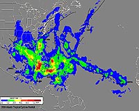 NASA Goddard Space Flight Center/SSAI Greenbelt MD (SPX) Dec 15, 2008 Hurricane, tropical storm and tropical depression rainfall caused many severe floods and numerous lost lives during the 2008 north Atlantic hurricane season. The north Atlantic hurricane season runs from June 1st to November 30th. The 2008 hurricane season had 16 named tropical cyclones and that was above the yearly average of 11. Haiti, Cuba and the Texas gulf coast were hardest hit with estimates of $54 billion in damage. Hurricanes Fay, Gustav, Ike, and tropicalstorm Hanna caused flooding in Haiti that contributed to the loss of over 800 lives. The image above shows estimates for rainfall contributed by named tropical cyclones. Although not a named storm, Tropical depression 16 was included because it caused extensive flooding in Central America. Areas with over 600mm (about 23.6 inches) of tropical cyclone rainfall are shown in bright red over eastern Cuba and western Haiti. A small area of southern Haiti is shown in dark red where totals of tropical cyclone rainfall were estimated to be over 850 mm(about 33.5 inches). The tracks of storms are shown in black. The general appearance of the tropical cyclone rainfall pattern is close to normal for Cuba and Haiti due their location in "Hurricane Alley." "Hurricane Alley" is an area of warm water in the Atlantic ocean stretching from the west coast of northern Africa to the east coast of central America and Gulf Coast of the southern United State where many hurricanes form. Those rainfall data (3B42) used in this analysis were from merged satellite rainfall estimates whose accuracy was calibrated with Tropical Rainfall Measuring Mission (TRMM) satellite data. TRMM is a joint mission between NASA and the Japan Aerospace Exploration Agency (JAXA) designed to monitor and study tropical rainfall. Share This Article With Planet Earth
