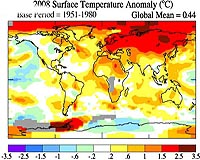 Greenbelt MD (SPX) Feb 24, 2009 Climatologists at the NASA Goddard Institute for Space Studies (GISS) in New York City have found that 2008 was the coolest year since 2000. The GISS analysis also showed that 2008 is the ninth warmest year since continuous instrumental records were started in 1880. The ten warmest years on record have all occurred between 1997 and 2008. The GISS analysis found that the global average surface air temperature was 0.44 degrees C (0.79 degrees F) above the global mean for 1951 to 1980, the baseline period for the study. Most of the world was either near normal or warmer in 2008 than the norm. Eurasia, the Arctic, and the Antarctic Peninsula were exceptionally warm (see figures), while much of the Pacific Ocean was cooler than the long-term average. The relatively low temperature in the tropical Pacific was due to a strong La Nina that existed in the first half of the year, the research team noted. La Nina and El Nino are opposite phases of a natural oscillation of equatorial Pacific Ocean temperatures over several years. La Nina is the cool phase. The warmer El Nino phase typically follows within a year or two of La Nina. The temperature in the United States in 2008 was not much different than the 1951-1980 mean, which makes it cooler than all the previous years this decade. "Given our expectation that the next El Nino will begin this year or in 2010, it still seems likely that a new global surface air temperature record will be set within the next one to two years, despite the moderate cooling effect of reduced solar irradiance," said James Hansen, director of GISS. The Sun is just passing through solar minimum, the low point in its 10- to 12-year cycle of electromagnetic activity, when it transmits its lowest amount of radiant energy toward Earth. The GISS analysis of global surface temperature incorporates data from the Global Historical Climatology Network of the National Oceanic and Atmospheric Administration's National Climate Data Center; the satellite analysis of global sea surface temperature of Richard Reynolds and Thomas Smith of NOAA; and Antarctic records of the international Scientific Committee on Antarctic Research. "GISS provides the ranking of global temperature for individual years because there is a high demand for it from journalists and the public," said Hansen. "The rank has scientific significance in some cases, such as when a new record is established. But rank can also be misleading because the difference in temperature between one year and another is often less than the uncertainty in the global average." Share This Article With Planet Earth