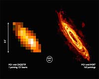 Detatiled Caption Description M31 extends several degrees on the sky, which means that it appears almost ten times bigger than the full moon. This is much larger than the field of view of the current Westerbork telescope (the white circle on the picture). With the Focal Plane Arrays of APERTIF, simultaneously aimed in different directions at the sky, the largest part of M31 can be observed with one single observation of the telescope. The image on the left is the result of an observation that lasted only 6.7 seconds. Because the APERTIF prototype is only installed in one of the Westerbork dishes, the images are not yet very sharp. However, once most of the fourteen Westerbork dishes are equipped with Focal Plane Arrays, very sharp images can be obtained. The image on the right also shows the distribution of atomic hydrogen in M31, on the same scale as on the left. This image hass been made a few years ago with the Westerbork telescope, but without the Focal Plane Arrays. To make this image, 163 separate observations were necessary with all fourteen Westerbork dishes, a process that took many weeks. If every Westerbork dish had a system like APERTIF, the image on the right could be made in a few days with only a few observations. Related Links . Space Telescope News and Technology at Skynightly.com