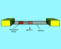 Berkeley CA (SPX) Jun 05, 2009 Berkeley Lab researchers have created a unique ultra-high density memory storage medium that can preserve digital data for a billion years.When it comes to data storage, density and durability have always moved in opposite directions - the greater the density the shorter the durability. For example, information carved in stone is not dense but can last thousands of years, whereas today's silicon memory chips can hold their information for only a few decades. Researchers with the U.S. Department of Energy's Lawrence Berkeley National Laboratory (Berkeley Lab) and the University of California (UC) Berkeley have smashed this tradition with a new memory storage medium that can pack thousands of times more data into one square inch of space than conventional chips and preserve this data for more than a billion years! This video shows an iron nanoparticle shuttle moving through a carbon nanotube in the presence of a low voltage electrical current. The shuttle's position inside the tube can function as a high-density nonvolatile memory element. (Courtesy of Zettl Research Group) "We've developed a new mechanism for digital memory storage that consists of a crystalline iron nanoparticle shuttle enclosed within the hollow of a multiwalled carbon nanotube," said physicist Alex Zettl who led this research. "Through this combination of nanomaterials and interactions, we've created a memory device that features both ultra-high density and ultra-long lifetimes, and that can be written to and read from using the conventional voltages already available in digital electronics." Zettl, one of the world's foremost researchers into nanoscale systems and devices, holds joint appointments with Berkeley Lab's Materials Sciences Division (MSD) and the Physics Department at UC Berkeley, where he is the director of the Center of Integrated Nanomechanical Systems. He is the principal author of a paper that has been published on-line by Nano Letters entitled: "Nanoscale Reversible Mass Transport for Archival Memory." Co-authoring the paper with Zettl were Gavi Begtrup, Will Gannett and Tom Yuzvinsky, all members of his research group, plus Vincent Crespi, a theorist at Penn State University. The ever-growing demand for digital storage of videos, images, music and text calls for storage media that pack increasingly more data onto chips that keep shrinking in size. However, this demand runs in sharp contrast to the history of data storage. Compare the stone carvings in the Egyptian temple of Karnak, which store approximately two bits of data per square inch but can still be read after nearly 4,000 years, to a modern DVD which can store 100 giga (billion) bits of data per square inch but will probably remain readable for no more than 30 years. "Interestingly," said Zettl, "the Domesday Book, the great survey of England commissioned by William the Conqueror in 1086 and written on vellum, has survived over 900 years, while the 1986 BBC Domesday Project, a multimedia survey marking the 900th anniversary of the original Book, required migration from the original high-density laserdiscs within two decades because of media failure." The illustration shows the configuration of a new digital memory storage device consisting of an iron nanoparticle shuttle that moves through a carbon nanotube when a voltage is applied. This memory device can pack a trillion bits of data into one square inch of medium and retain that data for a billion years. Zettl and his collaborators were able to buck data storage history by creating a programmable memory system that is based on a moveable part - an iron nanoparticle, approximately 1/50,000th the width of a human hair, that in the presence of a low voltage electrical current can be shuttled back and forth inside a hollow carbon nanotube with remarkable precision. The shuttle's position inside the tube can be read out directly via a simple measurement of electrical resistance, allowing the shuttle to function as a nonvolatile memory element with potentially hundreds of binary memory states. "The shuttle memory has application for archival data storage with information density as high as one trillion bits per square inch and thermodynamic stability in excess of one billion years," Zettl said. "Furthermore, as the system is naturally hermetically sealed, it provides its own protection against environmental contamination." The nanoscale electromechanical memory device can write/read data based on the position of an iron nanoparticle in a carbon nanotube. The memory devices here are displaying a binary sequence 1 0 1 1 0. The low voltage electrical write/read capabilities of the memory element in this electromechanical device facilitates large-scale integration and should make for easy incorporation into today's silicon processing systems. Zettl believes the technology could be on the market within the next two years and its impact should be significant. "Although truly archival storage is a global property of an entire memory system, the first requirement is that the underlying mechanism of information storage for individual bits must exhibit a persistence time much longer than the envisioned lifetime of the resulting device," he said. "A single bit lifetime in excess of a billion years demonstrates that our system has the potential to store information reliably for any practical desired archival time scale." The multiwalled carbon nanotube and enclosed iron nanoparticle shuttle were synthesized in a single step via pyrolysis of ferrocene in argon gas at a temperature of 1,000 degrees Celsius. The nanotube memory elements were then ultrasonically dispersed in isopropanol and deposited on a substrate. A transmission electron microscope provided high-resolution imaging in real time while the memory device was in operation. In laboratory tests, this device met all the essential requirements for digital memory storage including the ability to overwrite old data. "We be