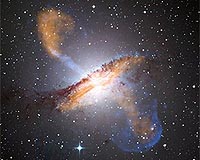 Boston MA (SPX) Feb 05, 2009 This image of Centaurus A shows a spectacular new view of a supermassive black hole's power. Jets and lobes powered by the central black hole in this nearby galaxy are shown by submillimeter data (colored orange) from the Atacama Pathfinder Experiment (APEX) telescope in Chile and X-ray data (colored blue) from the Chandra X-ray Observatory. Visible light data from the Wide Field Imager on the Max-Planck/ESO 2.2 m telescope, also located in Chile, shows the dust lane in the galaxy and background stars. The X-ray jet in the upper left extends for about 13,000 light years away from the black hole. The APEX data shows that material in the jet is travelling at about half the speed of light. Share This Article With Planet Earth