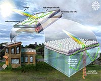 An artist's representation shows how a cost-effective solar concentrator could help make existing solar panels more efficient. The dye-based luminescent solar concentrator functions without the use of tracking or cooling systems, greatly reducing the overall cost compared to other concentrator technology. Dye molecules coated on glass absorb sunlight, and re-emit it at a different wavelengths. The light is trapped and transported within the glass until it is captured by solar cells at the edge. Some light passes through the concentrator, and is absorbed by lower voltage solar cells underneath. [Note: Graphic is not to scale.] Credit: Nicolle Rager Fuller, NSF