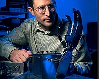 Nashville TN (SPX) Aug 22, 2007 Combine a mechanical arm with a miniature rocket motor: The result is a prosthetic device that is the closest thing yet to a bionic arm. A prototype of this radical design has been successfully developed and tested by a team of mechanical engineers at Vanderbilt University as part of a $30 million federal program to develop advanced prosthetic devices. "Our design does not have superhuman strength or capability, but it is closer in terms of function and power to a human arm than any previous prosthetic device that is self-powered and weighs about the same as a natural arm," says Michael Goldfarb, the professor of mechanical engineering who is leading the effort. The prototype can lift (curl) about 20 to 25 pounds - three to four times more than current commercial arms - and can do so three to four times faster. "That means it has about 10 times as much power as other arms despite the fact that the design hasn't been optimized yet for strength or power," Goldfarb says. The mechanical arm also functions more naturally than previous models. Conventional prosthetic arms have only two joints, the elbow and the claw. By comparison, the prototype's wrist twists and bends, and its fingers and thumb open and close independently. The Vanderbilt arm is the most unconventional of three prosthetic arms under development by a Defense Advanced Research Project Agency (DARPA) program. The other two are being designed by researchers at the Advanced Physics Laboratory at Johns Hopkins University in Baltimore, who head the program. Those arms are powered by batteries and electric motors. The program is also supporting teams of neuroscientists at the University of Utah, California Institute of Technology and the Rehabilitation Institute of Chicago who are developing advanced methods for controlling the arms by connecting them to nerves in the users' bodies or brains. "Battery power has been adequate for the current generation of prosthetic arms because their functionality is so limited that people don't use them much," Goldfarb says. "The more functional the prosthesis, the more the person will use it and the more energy it will consume." Increasing the size of the batteries is the only way to provide additional energy for conventionally powered arms and, at some point, the weight of additional batteries becomes prohibitive. It was the poor power-to-weight ratio of batteries that drove Goldfarb to look for alternatives in 2000 while he was working on a previous exoskeleton project for DARPA. He decided to miniaturize the monopropellant rocket motor system that is used for maneuvering in orbit by the space shuttle. His adaptation impressed the Johns Hopkins researchers, so they offered him $2.7 million in research funding to apply this approach to the development of a prosthetic arm. Goldfarb's power source is about the size of a pencil and contains a special catalyst that causes hydrogen peroxide to burn. When this compound burns, it produces pure steam. The steam is used to open and close a series of valves. The valves are connected to the spring-loaded joints of the prosthesis by belts made of a special monofilament used in appliance handles and aircraft parts. A small sealed canister of hydrogen peroxide that easily fits in the upper arm can provide enough energy to power the device for 18 hours of normal activity. The first prototype, which took a year to develop, was powered by "cold gas": compressed nitrogen. It allowed the researchers to test the fundamental design and to address the basic problems of control, leakage and noise. The team was happy to discover that they could solve all of the basic problems by designing the valves with the highest precision possible, with clearances of 50 millionths of an inch. "There are only a handful of machinists who can make valves with this precision. We found one and asked him to make them with the highest precision possible, which is actually higher than he can measure," says Goldfarb. "Normally in projects like this the surprises are unpleasant, but this was a pleasant one. The valves didn't leak, click or hiss!" After getting the arm working with cold gas, the engineers tore it down and rebuilt it to operate on "hot gas" - steam that is heated to 450 degrees Fahrenheit by the hydrogen peroxide reaction. One of their immediate concerns was protecting the wearer and others in close proximity from the heat generated by the device. They covered the hottest part, the catalyst pack, with a millimeter-thick coating of a special insulating plastic that reduced the surface temperature enough so it was safe to touch. The hot steam exhaust was also a problem, which they decided to handle in as natural a fashion as possible: by venting it through a porous cover, where it condenses and turns into water droplets. "The amount of water involved is about the same as a person would normally sweat from their arm in a warm day," Goldfarb says. To allow for thermal expansion, the engineers replaced the arm's nine valves with a set machined to a slightly lower tolerance, approximately 100 millionths of an inch. But when they began operating the rebuilt arm, they found that it hissed and leaked. At first, they thought that the arm had only a single leak, and spent several weeks trying to track it down. Finally, they realized that the noise and leakage were coming from all the valves. Replacing the high-precision valve set solved the problem. "We were astonished at by the difference between 50-millionths and 100-millionths: It made all the difference in the world," says Goldfarb. Their biggest problem operating with hot gas turned out to be finding belt material that was strong enough and could withstand the high temperatures involved. They tried silk surgical sutures, but found that silk wasn't strong enough. They tried nylon monofilament, which is stronger than steel, but it couldn't take the heat. Finally, after a long process of trial and error, 