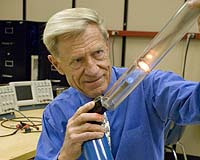 Salt Lake City UT (SPX) Jun 05, 2007 Salt Lake City UT (SPX) Jun 05, 2007 University of Utah physicists developed small devices that turn heat into sound and then into electricity. The technology holds promise for changing waste heat into electricity, harnessing solar energy and cooling computers and radars. "We are converting waste heat to electricity in an efficient, simple way by using sound," says Orest Symko, a University of Utah physics professor who leads the effort. "It is a new source of renewable energy from waste heat." Five of Symko's doctoral students recently devised methods to improve the efficiency of acoustic heat-engine devices to turn heat into electricity. They will present their findings on Friday, June 8 during the annual meeting of the Acoustical Society of America at the Hilton Salt Lake City Center hotel. Symko plans to test the devices within a year to produce electricity from waste heat at a military radar facility and at the university's hot-water-generating plant. The research is funded by the U.S. Army, which is interested in "taking care of waste heat from radar, and also producing a portable source of electrical energy which you can use in the battlefield to run electronics" he says. Symko expects the devices could be used within two years as an alternative to photovoltaic cells for converting sunlight into electricity. The heat engines also could be used to cool laptop and other computers that generate more heat as their electronics grow more complex. And Symko foresees using the devices to generate electricity from heat that now is released from nuclear power plant cooling towers. How to Get Power from Heat and Sound Symko's work on converting heat into electricity via sound stems from his ongoing research to develop tiny thermoacoustic refrigerators for cooling electronics. In 2005, he began a five-year heat-sound-electricity conversion research project named Thermal Acoustic Piezo Energy Conversion (TAPEC). Symko works with collaborators at Washington State University and the University of Mississippi. The project has received $2 million in funding during the past two years, and Symko hopes it will grow as small heat-sound-electricity devices shrink further so they can be incorporated in micromachines (known as microelectromechanical systems, or MEMS) for use in cooling computers and other electronic devices such as amplifiers. Using sound to convert heat into electricity has two key steps. Symko and colleagues developed various new heat engines (technically called "thermoacoustic prime movers") to accomplish the first step: convert heat into sound. Then they convert the sound into electricity using existing technology: "piezoelectric" devices that are squeezed in response to pressure, including sound waves, and change that pressure into electrical current. "Piezo" means pressure or squeezing. Most of the heat-to-electricity acoustic devices built in Symko's laboratory are housed in cylinder-shaped "resonators" that fit in the palm of your hand. Each cylinder, or resonator, contains a "stack" of material with a large surface area - such as metal or plastic plates, or fibers made of glass, cotton or steel wool - placed between a cold heat exchanger and a hot heat exchanger. When heat is applied - with matches, a blowtorch or a heating element - the heat builds to a threshold. Then the hot, moving air produces sound at a single frequency, similar to air blown into a flute. "You have heat, which is so disorderly and chaotic, and all of a sudden you have sound coming out at one frequency," Symko says. Then the sound waves squeeze the piezoelectric device, producing an electrical voltage. Symko says it's similar to what happens if you hit a nerve in your elbow, producing a painful electrical nerve impulse. Longer resonator cylinders produce lower tones, while shorter tubes produce higher-pitched tones. Devices that convert heat to sound and then to electricity lack moving parts, so such devices will require little maintenance and last a long time. They do not need to be built as precisely as, say, pistons in an engine, which loses efficiency as the pistons wear. Symko says the devices won't create noise pollution. First, as smaller devices are developed, they will convert heat to ultrasonic frequencies people cannot hear. Second, sound volume goes down as it is converted to electricity. Finally, "it's easy to contain the noise by putting a sound absorber around the device," he says. Studies Improve Efficiency of Acoustic Conversion of Heat to Electricity Here are summaries of the studies by Symko's doctoral students: -- Student Bonnie McLaughlin showed it was possible to double the efficiency of converting heat into sound by optimizing the geometry and insulation of the acoustic resonator and by injecting heat directly into the hot heat exchanger. She built cylindrical devices 1.5 inches long and a half-inch wide, and worked to improve how much heat was converted to sound rather than escaping. As little as a 90-degree Fahrenheit temperature difference between hot and cold heat exchangers produced sound. Some devices produced sound at 135 decibels - as loud as a jackhammer. -- Student Nick Webb showed that by pressurizing the air in a similar-sized resonator, it was able to produce more sound, and thus more electricity. He also showed that by increasing air pressure, a smaller temperature difference between heat exchangers is needed for heat to begin converting into sound. That makes it practical to use the acoustic devices to cool laptop computers and other electronics that emit relatively small amounts of waste heat, Symko says. -- Numerous heat-to-sound-to-electricity devices will be needed to harness solar power or to cool large, industrial sources of waste heat. Student Brenna Gillman learned how to get the devices - mounted together to form an array - to work together. For an array to efficiently convert heat to sound and electricity, its individual de