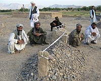 In this picture taken on May 5, 2009 villagers sit near the graves of victims of air strikes in the village of Garni, in the western Farah province. Angry Afghans shouted "death to America" and hurled stones at government offices on May 7, 2009 to protest against the killing of civilians in US-led air strikes, witnesses said. Shots were fired into the air during the protest, although it was not immediately clear by whom, while one demonstrator said the protest in the western town of Farah was gaining strength and threatened to turn violent. Photo courtesy AFP.