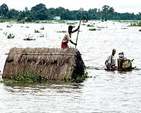 An Indian villager transports his mother to safety on a raft through floodwaters the Kaziranga National Park, some 285 kms from Guwahati, 02 August 2007. Rescue operations were underway as the number of people stranded by floods from torrential monsoon rains and glacial snowmelt climbed to 12 million across north India, officials said.Bihar, where flood waters have affected almost seven million people, and Assam were among the worst affected states. Photo courtesy AFP.