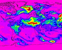 A preliminary forecast by Europe's GEMS project predicts regions expected to have elevated levels of aerosols (yellow and red) on Dec. 5, 2007. Credit: Jean-Jacques Morcrette/ECMWF
