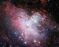 Paris, France (SPX) Jul 17, 2009 Located 7000 light-years away, towards the constellation of Serpens (the Snake), the Eagle Nebula is a dazzling stellar nursery, a region of gas and dust where young stars are currently being formed and where a cluster of massive, hot stars, NGC 6611, has just been born. The powerful light and strong winds from these massive new arrivals are shaping light-year long pillars, seen in the image partly silhouetted against the bright background of the nebula. The nebula itself has a shape vaguely reminiscent of an eagle, with the central pillars being the "talons". The star cluster was discovered by the Swiss astronomer, Jean Philippe Loys de Cheseaux, in 1745-46. It was independently rediscovered about twenty years later by the French comet hunter, Charles Messier, who included it as number 16 in his famous catalogue, and remarked that the stars were surrounded by a faint glow. The Eagle Nebula achieved iconic status in 1995, when its central pillars were depicted in a famous image obtained with the NASA/ESA Hubble Space Telescope. In 2001, ESO's Very Large Telescope (VLT) captured another breathtaking image of the nebula (ESO Press Photo 37/01), in the near-infrared, giving astronomers a penetrating view through the obscuring dust, and clearly showing stars being formed in the pillars. The newly released image, obtained with the Wide-Field Imager camera attached to the MPG/ESO 2.2-metre telescope at La Silla, Chile, covers an area on the sky as large as the full Moon, and is about 15 times more extensive than the previous VLT image, and more than 200 times more extensive than the iconic Hubble visible-light image. The whole region around the pillars can now be seen in exquisite detail. The "Pillars of Creation" are in the middle of the image, with the cluster of young stars, NGC 6611, lying above and to the right. The "Spire" - another pillar captured by Hubble - is at the centre left of the image. Finger-like features protrude from the vast cloud wall of cold gas and dust, not unlike stalagmites rising from the floor of a cave. Inside the pillars, the gas is dense enough to collapse under its own weight, forming young stars. These light-year long columns of gas and dust are being simultaneously sculpted, illuminated and destroyed by the intense ultraviolet light from massive stars in NGC 6611, the adjacent young stellar cluster. Within a few million years - a mere blink of the universal eye - they will be gone forever. Share This Article With Planet Earth