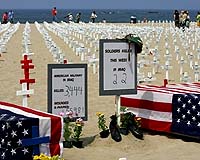 The latest US casualty tally is displayed at the Arlington West display of war memorial crosses for military personnel killed in Iraq organized by Veterans for Peace (VFP) on Santa Monica Beach 26 May 2007 in Santa Monica, California. Each white cross represents one US military person killed. Because of space limitations cramped by the ever-increasing number of dead, red crosses represent 10 deaths. 22 faux coffins draped in US flags represent the total killed this week. The current overall total is 3,444. The display will remain up for the duration of the Memorial Day weekend. Photo courtesy AFP.