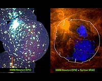 The images show the Orion nebula with its hot gas cloud. The left panel is an image obtained with XMM-Newton data from its European Photon Imaging Camera (EPIC) in X-rays. The right panel shows XMM-Newton data, compared to Spitzer observations of the same region. The Spitzer image is a composite image of data obtained in the infrared. Credits: Panel A: XMM-Newton EPIC (Guedel et al.), Panel B: AAAS/Science (ESA XMM-Newton and NASA Spitzer data)