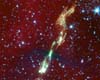A developing star wrapped in a black cocoon of dust is seen sprouting giant jets in a new image from NASA's Spitzer Space Telescope. The stellar portrait, captured in infrared light, offers the first glimpse at a very early stage in the life of an embryonic sun-like star -- a time when the star's natal envelope is beginning to flatten and collapse, and streams of gas are escaping. The observations will ultimately help astronomers better understand how stars and their planets form.
