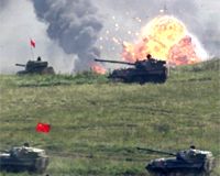 Russian Federation, Chebarkul : Chinese armoured personnel carriers take part in war games in Chebarkul, 17 August 2007. The activities are part of the Peace Mission 2007 counter-terrorism exercise of Shanghai Cooperation Organization. The presidents of Russia, China and four other Central Asian states attended unprecedented joint military exercises intended as a display of strength before the Western world. AFP Photo / Maxim Marmur
