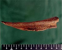 Scratches and notches on the 5-inch bone awl indicate it probably was used in conjunction with a stone knife to punch holes in leather, perhaps for clothing. The nature of the activity suggests that the lifestyle of its users was more settled than nomadic.