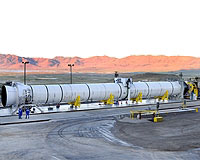 NASA Ares I First Stage Motor To be Tested August 25Promontory UT (SPX) Jul 22, 2009 NASA and ATK unveil the completed Ares I first stage five-segment solid rocket booster in Promontory, Utah. The completed solid rocket booster is now installed horizontally in a test stand that was modified from the space shuttle's four-segment configuration to fit the new five-segment Ares I booster. Instrumentation will be installed over the next month in preparation for the first major ... read more |