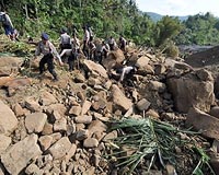 A rescue team continues their search for victims or suvivors from collapse buildings in Padang, West Sumatra on October 6, 2009 six days after a 7,6 quake hits the area. Fresh international aid was on its way to earthquake victims in the Indonesian city of Padang as schools and shops reopened despite the stench of death and shortages of water. Photo courtesy AFP<>