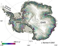 Satellite-derived image of the surface topography of Antarctica. Shown in color are the flow speeds of glaciers draining ice into the oceans. The scale is meters per year. It is noticeable how the rate speeds up in narrow glacier outlets. Credit: Jonathan Bamber