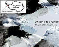 Boulder CO (SPX) Mar 26, 2008 Satellite imagery from the University of Colorado at Boulder's National Snow and Ice Data Center shows a portion of Antarctica's massive Wilkins Ice Shelf has begun to collapse because of rapid climate change in a fast-warming region of the continent. While the area of collapse involves 160 square miles at present, a large part of the 5,000-square-mile Wilkins Ice Shelf is now supported only by a narrow strip of ice between two islands, said CU-Boulder's Ted Scambos, lead scientist at NSIDC. "If there is a little bit more retreat, this last 'ice buttress' could collapse and we'd likely lose about half the total ice shelf area in the next few years." In the past 50 years, the western Antarctic Peninsula has experienced the biggest temperature increase on Earth, rising by 0.9 degree F per decade. "We believe the Wilkins has been in place for at least a few hundred years, but warm air and exposure to ocean waves are causing a breakup," said Scambos, who first spotted the disintegration activity in March. Satellite images indicate the Wilkins began its collapse on Feb. 28. Data revealed that a large iceberg, measuring 25.5 by 1.5 miles, fell away from the ice shelf's southwestern front, triggering a runaway disintegration of 220 square miles of the shelf interior. The Wilkins Ice Shelf is a broad sheet of permanent floating ice on the southwest Antarctic Peninsula roughly 1,000 miles south of South America. The edge of the shelf crumbled into the sky-blue pattern of exposed deep glacial ice that has become characteristic of climate-induced ice shelf breakups such as the Larsen B ice shelf breakup in 2002, said Scambos. A narrow beam of intact ice about 3.7 miles wide was protecting the remaining shelf from further breakup as of March 23. Scientists track ice shelves and study collapses carefully because some of them hold back glaciers, which if unleashed, can accelerate and raise sea level, Scambos said. "The Wilkins disintegration won't raise sea level because it already floats in the ocean, and few glaciers flow into it. However, the collapse underscores that the Wilkins region has experienced an intense melt season. Regional sea ice has all but vanished, leaving the ice shelf exposed to the action of waves." With Antarctica's summer melt season drawing to a close, scientists do not expect the Wilkins to further disintegrate in the next several months. "This unusual show is over for this season," Scambos said. "But come January, we'll be watching to see if the Wilkins continues to fall apart." After images from NASA's Moderate Resolution Imaging Spectroradiometer, or MODIS, and data from the ICESat satellite showed that a portion of the ice shelf was in a state of collapse in March, Scambos alerted colleagues around the world. The British Antarctic Survey flew over the shelf, collecting video footage and other observations. BAS glaciologist David Vaughan, who said the ice shelf is supported by a single strip of ice strung between two islands, said the Wilkins is the largest ice shelf on West Antarctica yet to be threatened. "This shelf is hanging by a thread." Associate Professor Cheng-Chien Liu at Taiwan's National Cheng-Kung University used high-resolution color satellite images of the area from Taiwan's Formosat-2 satellite operated by the National Space Organization to analyze the activity. "It looks as if something is slicing the ice shelf piece by piece on an incredible scale, kilometers long but only a few hundred meters in width," Cheng-Chien said. In addition, Andres Rivera and Gino Cassasa at the Laboratory for Glaciology and Climate Change at the Center of Scientific Study in Chile acquired images of the Wilkins from the ASTER instrument aboard NASA's Terra satellite. The combined efforts have begun to provide observational data that will improve scientific understanding of the mechanisms behind ice shelf collapse, Scambos said. "The Wilkins is an example of an event we don't see very often, but it's a key process in being able to predict how sea level will change in the future." The Wilkins is one of a string of ice shelves that have collapsed in the West Antarctic Peninsula in the past 30 years. The Larsen B became the most well-known of these, disappearing in just over 30 days in 2002. The Prince Gustav Channel, Larsen Inlet, Larsen A, Wordie, Muller and Jones ice shelf collapses also underscore the unprecedented warming in this region of Antarctica, said Scambos. Related Links University of Colorado at Boulder Beyond the Ice Age