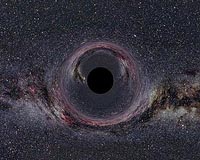 The computer-generated image shows a fictitious black hole the equivalent of 10 times the Sun's mass, viewed from a distance of 600 kilometres. In the background the Milky Way appears distorted due to the curvature of space. Credit: Ute Kraus (CC-BY-SA 2.0).