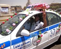 A police officer makes the V-sign for victory as he sits in his decorated vehicle as the capital prepares for the official withdrawal of US troops from cities and towns across the nation on June 29, 2009, in central Baghdad. Iraqis prepared for a massive party in Baghdad to celebrate the imminent withdrawal of US troops from cities, towns and villages on June 30th, as the conflict-torn nation takes sole charge of its security. Photo courtesy AFP.