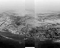 This composite was produced from images returned on 14 January 2005, by ESA's Huygens probe during its successful descent to land on Titan. It shows the boundary between the lighter-coloured uplifted terrain, marked with what appear to be drainage channels, and darker lower areas. These images were taken from an altitude of about 8 kilometres with a resolution of about 20 metres per pixel. Credits: ESA/NASA/JPL/University of Arizona