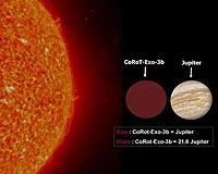 The object, named COROT-exo-3b, is about the size of Jupiter, but packs more than 20 times the mass. It takes only 4 days and 6 hours to orbit its parent star, which is slightly larger than the Sun.