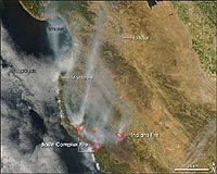 Washington DC (SPX) Jul 03, 2008 Numerous wildfires continue to burn out of control throughout California. Many of these fires were ignited in late June by dry lighting and made worse by parched conditions and a lack of rainfall, fire officials report. NASA's Aqua satellite captured this image of several of the blazes as it passed over California on June 30, 2008. This image specifically shows the fires burning in the area south of Monterey, some of the state's largest according to fire officials. Active fires are outlined in red. Smoke can also be seen billowing north up the California coastline. According to news reports, about 364,600 acres, or almost 570 square miles, of land throughout the state have already burned, and most of the blazes have not yet been contained. Skies in the north were mostly cloudy when NASA's Aqua satellite passed over California on June 30, 2008, but the Moderate Resolution Imaging Spectroradiometer (MODIS) sensor was able to get this cloud-free shot of Southern California showing fires burning south of Monterey. Places where the sensor detected actively burning fires are outlined in red. Smoke spreads north up the coast. The two fires pictured are among the largest of scores of fires burning in the state. According to the July 1 report from the National Interagency Fire Center, the Indians Fire was 81,378 acres and 95 percent contained; the Basin Complex Fire was 39,906 acres and 3 percent contained. The high-resolution image provided above is at MODIS' maximum spatial resolution (level of detail) of 250 meters per pixel. The MODIS Rapid Response Team provides twice-daily images of Northern and Southern California in additional resolutions and formats, including an infrared-enhanced version that highlights the presence of burned ground. Related Links Forest and Wild Fires - News, Science and Technology