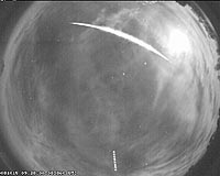 At 05:28 am on Wednesday morning, October 15, all seven cameras of Western's Southern Ontario Meteor Network (SOMN) recorded a bright, slow fireball in the predawn sky. In the all-sky view from Orangeville the fireball passes from upper left (North) to right (West) ending near the setting moon (the brightest object at upper right). For high-resolution images, videos and maps, click here.