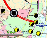 Beijing (XNA) Jul 30, 2008 While the best observation place in China for Friday's solar eclipse is a small county in the far-away Xinjiang Uygur Autonomous region, most people can also see it in all its glory on their laptop. The Chinese Academy of Sciences (CAS) will broadcast the total solar eclipse, the first in China this century, live on the Internet, the Division of Information Technical Sciences (ITS) said on Tuesday. On Aug. 1, the total eclipse will be visible from within a narrow corridor that traverses half the Earth. The path of the moon's umbral shadow will begin in Canada and extend across northern Greenland, the Arctic, central Russia and Mongolia before ending in northern China. A partial eclipse will be seen within the much broader path of the moon's partial shadow, which includes northeastern North America, most of Europe and Asia. It will make its final stop at sunset in Xi'an, capital of Shaanxi Province. ITS will provide live eclipse coverage in Xi'an from 6:20 p.m. to 8 p.m. on the Internet. Two astronomers will have an online discussion with netizens. Nanjing Purple Mountain Observatory of CAS (www.pmo.jsinfo.net) and Shanghai Astronomical Observatory Online (www.astron.sh.cn/live/2008eclipse) will also broadcast the eclipse live. In China, Yiwu County, 500 km east of Urumqi, capital of Xinjiang, will get the best view of the eclipse. It will start at about 7 p.m. (Beijing Time) and last about two minutes. People in Hong Kong and such provinces as Shanxi and Gansu will also see a total or partial eclipse. It will not be visible in Beijing. It is advised not to look directly at the sun with the naked eye or through a telescope. According to astronomers, it's safe to project the sun's image through a pinhole or a telescope onto a piece of white paper or cardboard. A solar eclipse occurs when the moon passes between the Earth and Sun, totally or partially blocking the Earth's view of the sun. The next total solar eclipse will occur in China in January.