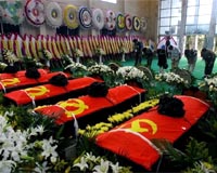 A military funeral with full honours is held for the five crew members of the helicopter that crashed on May 31 during a mission to evacuate 13 people injured in the May 12 earthquake, in Chengdu, southwest China's Sichuan province on June 13, 2008. The Mi-171 transport helicopter was found just northwest of the town of Yingxiu in mountainous Sichuan province, along with the bodies of 17 people on board. Photo courtesy AFP.