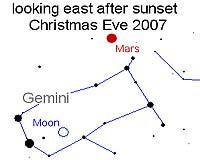 Pasadena CA (SPX) Dec 21, 2007 It's Christmas Eve, and you're snuggled cozily in your den. A glowing fire gently crackles and pops in the fireplace, and your head starts to droop as you nod off. Just then, something cold and wet nudges your cheek. You open your eyes to stare directly into a large black nose. It's time to take the dog for his walk. Grumbling in vain, you put on your coat, snap the leash onto the wiggling dog's collar, open the door to a rush of cold air. You step outside and enter a magical landscape. The night isn't dark, it's glowing with a silvery-white light. Up above, the 98% full moon looks huge and clear in the azure sky. It just might be the brightest moon you've ever seen. That's because it's the highest-riding full moon until the year 2023. And not far from the beautiful moon glows fireplace-red Mars. This Christmas Eve, Mars is at its closest to Earth for the next nine years. Mars is also "at opposition." That's astronomy-lingo for "directly opposite the sun." It means Mars is up whenever the sun is down: on Christmas Eve, the Red Planet will be visible all night long. As Christmas scenes go, it doesn't get much better. Gliding in formation across the sky, the moon and Mars seem so close you could almost reach up, grab the pair and bounce them down the street for Fido to retrieve. Or maybe you could lasso them, as George says in the movie It's a Wonderful Life. "Just say the word and I'll throw a lasso around it and pull it down. Hey! That's a pretty good idea! I'll give you the moon, Mary...." In the years ahead, NASA is going to lasso the moon. NASA's giant Ares rocket, still on the drawing board, will take form and then take mankind back to that brilliant silver orb where scientists will learn how to harness the moon's powers. Plans are to establish a lunar base for exploration and use the moon's surface as a springboard to even further destinations. At the moon's poles there is evidence of hydrogen and perhaps actual water frozen in the soil. Furthermore, ordinary moonrocks are made of minerals that contain more than 40% oxygen. These are resources that can be used to produce rocket fuel, breathable air and a welcome drink on a dry, dusty world. Maybe on some future Christmas Eve, one of us will step outside of our cozy lunar cabin and walk our space-suited dog with long, floating steps down some dusty lunar road. We'll look up and say, "There's a pretty full Earth tonight!" But on this frosty Christmas Eve, your feet crunch Earth's cold ground with a crisp clear sound as you walk back toward the house looking up through the silvery stillness at the lovely moon and its bright partner, Mars. The only other sounds you hear are dog tags jingling like sleigh bells. Suddenly a shadow flits across the moon. A cloud? A plane? A sleigh! Maybe those were sleigh bells you heard! Smiling to yourself, you open the door to go back inside, taking one last glance at the night sky and one of the loveliest heavenly sights you'll see for years. Don't forget to thank Fido. Related Links Astronomy News from Skynightly.com