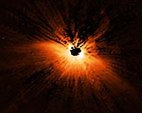 Greenbelt MD (SPX) Jan 11, 2008 This is not your typical flying insect. It has a wingspan of about 22 billion miles. The wing- like structure is actually a dust disk encircling the nearby, young star HD 61005, dubbed "The Moth." Its shape is produced by starlight scattering off dust. Dust disks around roughly 100-million-year-old stars like HD 61005 are typically flat, pancake-shaped structures where planets can form. But images taken with NASA's Hubble Space Telescope of "The Moth" are showing that some disks sport surprising shapes. "It is completely unexpected to find a dust disk with this unusual shape," said senior research scientist Dean Hines of the Space Science Institute in Boulder, Colo., and a member of the Hubble team that discovered the disk. "We think HD 61005 is plowing through a local patch of higher-density gas in the interstellar medium, causing material within HD 61005's disk to be swept behind the star. What effect this might have on the disk, and any planets forming within it, is unknown." Hines called this possible collision "unusual, because we don't expect very much material to be in the solar neighborhood. That's because the area through which our Sun is moving was evacuated within the past few million years by at least one supernova, the explosion of a massive star. Yet, here's evidence of dense material that's very close, only 100 light-years away." Astronomers have found evidence that the environment in which a star forms influences its prospects for planet formation. Hubble has actually seen that young planet-forming disks can be affected directly by their environment. The harsh stellar radiation from the Trapezium stars in the Orion Nebula has altered some disks. It is unclear, however, what effect passage through a cloud similar to the one in which HD 61005 finds itself would have on planet formation. Researchers have speculated that passage through dense regions of the interstellar medium could impact the atmospheres of evolving planets. The Moth is part of a survey of Sun-like stars that Hines and collaborators observed with Hubble's Near-Infrared Camera and Multi-Object Spectrometer (NICMOS) and NASA's Spitzer Space Telescope to study the formation and evolution of planetary systems. Under the lead of Michael Meyer of the University of Arizona in Tucson, the team initially used Spitzer to look for heat radiation - the tell-tale sign of dust warmed by the star - to identify interesting star systems. Hines then teamed with Glenn Schneider of the University of Arizona to use Hubble's high- contrast imaging capability of the NICMOS coronagraph to image these disks and reveal where the dust detected by Spitzer resides. The NICMOS coronagraph blocked out the starlight so that astronomers could see details in the surrounding disk. "These symbiotic capabilities, uniquely implemented in NASA's Great Observatories, provide astronomers with the powerful observational tools to study the circumstellar environments of potentially planet-forming systems," Schneider said. Added Meyer: "Combining observations from these two spacecraft gives us information about the composition of the dust grains, whether they're icy or sandy, or whether they're like the sooty smoke particles rising from a chimney. The composition and sizes of the dust can tell us a lot about the dynamics and evolution of a solar system. In our solar system, for example, astronomers have evidence of rocks smashing into each other and generating dust, as in the asteroid and Kuiper belts. We're seeing these same processes unfold in other planetary systems." Related Links NASA's Hubble site Stellar Chemistry, The Universe And All Within It