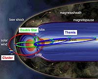 Paris, France (ESA) Sep 12, 2007 Colourful aurorae and perturbations of GPS signals are just some of the effects of a magnetospheric phenomenon known as a magnetic substorm. Up to now, the onset of this phenomenon has been explained by two competing models: current disruption and near-Earth reconnection. A new study published 20 January 2007 in Geophysical Research Letters challenges this binary vision of substorm onset. Thanks to simultaneous measurements performed by the four satellites of the ESA/NASA Cluster mission and the CNSA/ESA Double star mission, a third type of substorm onset is now suggested. Very bright and colourful aurorae due to magnetic substorms are often observed at high latitudes such as Scandinavia or Canada. These aurorae are primarily caused by energetic electrons spiralling down the Earth's magnetic field lines and colliding with atmospheric atoms at altitudes of about 100 km. The energetic electrons come from within the Earth's magnetotail. The magnetotail is a region of space located on the nightside of Earth where the solar wind stretches out terrestrial magnetic field lines into a long tail. In its centre, a denser region known as the plasma sheet is present. A substorm induces violent changes of the characteristics of the plasma sheet. It energizes ions and electrons and hurls them Earthward and substorms can occur as a series or in isolation. Apart from the beautiful light show, substorms also excite a large portion of the Earth's ionosphere, perturbing the reception of GPS signals and communications between Earth and orbiting satellites. Despite decades of space research, the onset mechanism of substorms remains a mystery. What scientists agree on is that three events are associated with the substorm onset: 1) auroral brightening, 2) current disruption, and 3) magnetic reconnection. The auroral brightening is what is visible from the ground: a sudden change of the aurora from light grey to very bright and colourful aurorae at about 100 km altitude. The current disruption occurs at roughly 60 000 km altitude on the nightside, or about 1/6 the distance to the Moon and is associated with large amplitude and turbulent magnetic field fluctuations. Years of data collected in space have shown that magnetic reconnection, which heats and accelerates plasma, occurs on average at around 1/3 the distance to the Moon or 120 000 km, in a thin plane close to the magnetic equator of the magnetotail. So far, space scientists generally believed that these events occur in one of the two following sequences However, a recent study published 20 January 2007 in Geophysical Research Letters, challenges this vision of substorm onset, thanks to a fortuitous spacecraft constellation of the four satellites composing the ESA/NASA Cluster mission and the two satellites of the CNSA/ESA Double Star mission. Data collected on 26 September 2005 between 08 and 10 UT captured the occurrence of three consecutive substorm onsets. But for the first time, these data indicate that the current disruption process and magnetic reconnection can coincide in space and time showing possibly the two sides of the same process. Professor Sergeev (St Petersburg State University, Russia) and co-authors also found that in this case, magnetic reconnection occurred closer to the Earth than usual, almost co-located with the current disruption process, between 60 000 km and 90 000 km. Related localized auroral brightenings were captured a few tens of seconds later by an ultra violet (UV) imager onboard the NASA IMAGE satellite. Mid-February 2007, NASA launched a mission called THEMIS, dedicated to the study of substorm onset. It is composed of five spacecraft. The on-going satellite measurements are associated with a network of all-sky cameras and magnetometers on the ground in Canada and northern United States to monitor the auroral activity. The five satellites are in the process of being placed in a special orbit so that every four days, they will line up in the magnetotail to simultaneously monitor the current disruption region and the magnetic reconnection region. "Thanks to Cluster, Double Star and the THEMIS missions, this is the first time in history of space physics that such a high number of scientific satellites are in operation simultaneously. It represents an unprecedented opportunity to study the global solar-magnetospheric environment and the physical processes involved. And one of the prime scientific targets is a better understanding of substorm onset," says Philippe Escoubet, Cluster and Double Star project scientist of the European Space Agency. Related Links Double Star Mission THEMIS at NASA The Physics of Time and Space