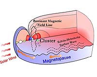 The Polar satellite links Cluster data to Ground-Based measurements The impact of this fast flow of solar particles on the Earth's magnetosphere induced undulations of the magnetopause such as those depicted in Animation 1. As a consequence, the Cluster satellites outbound from the magnetosphere crossed the magnetopause not once but periodically, roughly every 11 minutes or at 1.5 mHz, a typical period for Pc5 waves. The authors of this study surmise that these undulations induced compressional waves propagating inward from the magnetopause, which coupled to terrestrial magnetic field lines close to the location of Polar and several geosynchronous satellites. All these spacecraft, over a period of hours, picked up clear signatures of this magnetic Field Line Resonance (FLR) with the same period as the magnetopause flapping. Meanwhile, ionospheric signatures of this FLR were measured by SuperDARN HF radars over a large portion of the northern hemisphere. Magnetically conjugated magnetometers of the CARISMA network were recording the ground footprint of this 1.5-1.6 mHz FLR. Taking into account all these data, the authors of this study found that these Pc5 waves result from the excitation of a magnetospheric waveguide either by the Kelvin-Helmoltz instability or via overreflection acting on the duskside magnetopause. "This excellent conjunction of ground- and space-based instrumentation provides a means to trace energy extracted from the solar wind into the Earth's magnetosphere before ultimately being deposited into the upper atmosphere. During this event, the Polar data provided a direct link between Cluster measurements of magnetopause undulations and FLR signatures detected by SuperDARN radars and the CARISMA magnetometer network. This is the first study to have such an advantageous instrumentation collecting data over the same time interval," comments lead author Dr. Jonathan Rae, scientist at the University of Alberta, Edmonton, Canada and lead author of this study. "ULF waves affect the entire magnetosphere. This study underlines once again the scientific need of a constant monitoring by ground-based geophysical instruments to put data measured in space in a global context. In situ, Cluster is also revolutionizing our understanding of ULF waves by using the unique capability of its four spacecraft flying in formation, the subject of a PhD very recently defended at Royal Institute of Technology (KTH), Stockholm, Sweden, by Tommy Eriksson," says Philippe Escoubet, ESA Cluster and Double Star project scientist.