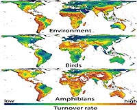 La Jolla CA (SPX) Nov 04, 2008 Biologists have long suspected that amphibians, whose moist permeable skins make them susceptible to slight changes in the environment, might be good bellwethers for impending alterations in biodiversity during rapid climate change. Now two University of California biologists have verified the predictive power of this sensitive group of animals in a global study of species turnover among amphibians and birds. The study appears this week in the advance online version of the journal Proceedings of the National Academy of Sciences. "our study supports the role of amphibians as 'canaries in the coal mine'," said Lauren Buckley, a postdoctoral fellow at UC Santa Barbara's National Center for Ecological Analysis and Synthesis and the first author of the study. "Amphibians are likely to be the first to respond to environmental changes and their responses can forecast how other species will respond." "Amphibians are much more tuned in to the changes in their specific environments," said Walter Jetz, an associate professor of biology at UC San Diego and the other author of the study. "They are much more sensitive to differences in environmental conditions as you move geographically from one location to another." The two scientists used maps of the environment and amphibian and bird distributions to answer the question of how the environment-as well as the distribution of birds and amphibians-changes as one moves from one place to another around the globe. The researchers found that if the environment changes rapidly as one travels from one location to another, the amphibian and bird communities also change rapidly. However, the species of amphibians would change more quickly than species of birds. This confirms that amphibians are particularly sensitive to changes in the environment, the researchers conclude, and that this sensitivity is particularly acute given their narrow distributions. Whether one is traveling through a tropical or temperature region also influences how quickly the types of animals change. Given a mountain of a certain size, the researchers found, the amphibian and bird communities change more quickly if one is climbing a mountain in the tropics than in a temperate region. "There are more species in the tropics and the species are generally more specially adapted to particular environmental conditions," said Jetz. "This suggests that tropical species may be more severely impacted by a given temperature increase as a result of climate change." For the study, he and Buckley produced a series of global maps of environmental turnover and the associated changes in amphibian and bird communities that reveal that the identities of birds and amphibians change particularly quickly in mountainous regions such as the Andes and Himalayas. "Understanding how environmental changes over space influence biodiversity patterns provides important background for forecasting how biodiversity will respond to environmental changes over time such as ongoing temperature increases," said Buckley. The study was supported by grants from the National Science Foundation, UC Santa Barbara and the State of California. Related Links University of California, San Diego Darwin Today At TerraDaily.com