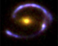 A colour HST image of the "Cosmic Eye". The red source in the middle is the foreground lensing galaxy, whilst the blue ring is the near-complete Einstein ring image of the background star-forming galaxy.