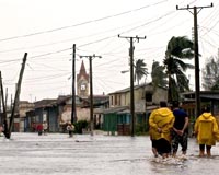 People walk through the water as they evacuate the flooded village of Surgidero de Batabano, some 60 km south of Havana, on September 10, 2008. As the deadly hurricane ploughed towards Texas, it left a trail of devastation across Cuba, including five dead, 2.6 million evacuated and thousands of buildings, crops and power cables destroyed. Photo courtesy AFP