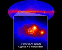 Fermi Telescope Peers Deep Into MicroquasarWashington DC (SPX) Nov 30, 2009 NASA's Fermi Gamma-ray Space Telescope has made the first unambiguous detection of high-energy gamma-rays from an enigmatic binary system known as Cygnus X-3. The system pairs a hot, massive star with a compact object - either a neutron star or a black hole - that blasts twin radio-emitting jets of matter into space at more than half the speed of light. Astronomers call these systems ... read more |