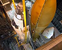 Cape Canaveral FL (SPX) Apr 29, 2008 Space shuttle Discovery rolled into the Vehicle Assembly Building at NASA's Kennedy Space Center in Florida on Saturday, where the shuttle's external tank and two solid rocket boosters awaited. Discovery was then lifted to vertical inside the building's 50-story-tall transfer aisle, lowered into a high bay and joined with the tank and boosters atop the mobile launcher platform. The fully assembled space shuttle will remain in the Vehicle Assembly Building for a week, undergoing final checkouts before rolling out to Launch Pad 39A on May 3. STS-124 is the second of three flights to deliver the Japan Aerospace Exploration Agency's Kibo laboratory to the International Space Station. Primary payloads are the tour-bus-sized Japanese Experiment Module-Pressurized Module and the lab's robotic arm system. Mark Kelly will command the seven-member crew, which includes Pilot Ken Ham, Mission Specialists Karen Nyberg, Ron Garan, Mike Fossum, Greg Chamitoff and Japan Aerospace Exploration Agency astronaut Akihiko Hoshide. Chamitoff will replace Expedition 16/17 Flight Engineer Garrett Reisman and remain aboard the station as a member of the Expedition 17 crew. The crew will visit Kennedy for the three-day Terminal Countdown Demonstration Test, which culminates in a countdown dress rehearsal May 9. Launch is targeted for May 31. Related Links STS-124 Mission Summary (PDF) Shuttle at NASA Watch NASA TV via Space.TV Space Shuttle News at Space-Travel.Com