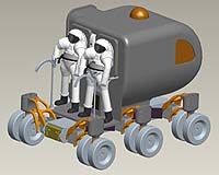 Future explorers may traverse the moon in small pressurized rovers with built-in spacesuits, such as the conceptual design shown here. Credit: NASA