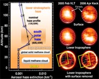 Paris, France (SPX) Oct 12, 2007 Noted for its bizarre hydrocarbon lakes and frozen methane clouds, Saturn's largest moon, Titan, also appears to have widespread drizzles of methane, according to a team of astronomers at the University of California, Berkeley. New near-infrared images from ESO's Very Large Telescope (VLT) in Chile and the W. M. Keck Observatory in Hawaii show for the first time a nearly global cloud cover at high elevations and, dreary as it may seem, a widespread and persistent morning drizzle of methane over the western foothills of Titan's major continent, Xanadu. In most of the Keck and VLT images, liquid methane clouds and drizzle appear at the morning edge of Titan, the arc of the moon that has just rotated into the light of the sun. "Titan's topography could be causing this drizzle," said Imke de Pater, member of the team that made the discovery. "The rain could be caused by processes similar to those on Earth: moisture laden clouds pushed upslope by winds condense to form a coastal rain." Lead author Mate Adamkovics noted that only areas near Xanadu exhibited morning drizzle, and not always in the same spot. Depending on conditions, the drizzle could hit the ground or turn into a ground mist. The drizzle or mist seems to dissipate after local mid-morning, which, because Titan takes 16 Earth days to rotate once, is about three Earth days after sunrise. "Maybe only Xanadu has misty mornings," he said. Adamkovics first saw evidence of widespread, cirrus-like clouds and methane drizzle when analysing data taken on 28 February 2005 from a new instrument on the VLT - the Spectrograph for INtegral Field Observations in the Near Infrared (SINFONI). Further images and spectra taken on April 17, 2006, by the OH-Suppressing Infra-Red Imaging Spectrograph (OSIRIS) on Keck II confirmed the clouds. Both instruments measure spectra of light at many points in an image rather than averaging over a small aperture or slit. By subtracting light reflected from the surface from the light reflected by the clouds, the researchers were able to obtain images of the clouds covering the entire moon. Titan, larger than the planet Mercury, is the only moon in the Solar System with a thick atmosphere, which is comprised mostly of nitrogen and resembles Earth's early atmosphere. Previous observations have shown that the entire moon is swathed in a hydrocarbon haze extending as high as 500 kilometres, becoming thinner with height. The south pole area exhibits more haze than elsewhere, with a hood of haze at an altitude between 30 and 50 kilometres. Because of its extremely cold surface temperature - minus 183 degrees Celsius - trace chemicals such as methane and ethane, which are explosive gases on Earth, exist as liquids or solids on Titan. Some level features on the surface near the poles are thought to be lakes of liquid hydrocarbon analogous to Earth's watery oceans, and presumably these lakes are filled by methane precipitation. ESA's Huygens probe observed features that appear to be controlled by flows down slopes, whether caused by precipitation or springs. Until now, however, no rain had been observed directly. "Widespread and persistent drizzle may be the dominant mechanism for returning methane to the surface from the atmosphere and closing the methane cycle, [analogous to Earth's water cycle]", the authors wrote. Actual clouds on Titan were first imaged in 2001 by de Pater's group and colleagues at Caltech using the Keck II telescope with adaptive optics and confirmed what had been inferred from spectra of Titan's atmosphere. These frozen methane clouds hovered at an elevation of about 30 kilometres around Titan's south pole. Since then, isolated ethane clouds have been observed at the north pole by NASA's Cassini spacecraft, while both Cassini and Keck photographed methane clouds scattered at mid-southern latitudes. Also in 2005, the ESA Huygens probe, released by Cassini, plummeted through Titan's atmosphere, collecting data on methane relative humidity. These data provided evidence for frozen methane clouds between 25 and 30 kilometres in elevation and liquid methane clouds - with possible drizzle - between 15 and 25 kilometres high. The extent of the clouds detected in the descent area was unclear, however, because "a single weather station like Huygens cannot characterize the meteorology on a planet-wide scale," said co-author Michael H. Wong. The new images show clearly a widespread cloud cover of frozen methane at a height of 25 to 35 kilometres - "a new type of cloud, a big global cloud of methane," Adamkovics said - that is consistent with Huygens' measurements, plus liquid methane clouds in the tropopause below 20 kilometres with rain at lower elevations. "The clouds we see are like cirrus clouds on Earth," Adamkovics said. "One difference is that the methane droplets are predicted to be at least millimetre-sized on Titan, that is, a thousand times larger than in terrestrial clouds. Since the clouds have about the same moisture content as Earth's clouds, this means the droplets on Titan are much more spread out and have a lower density in the atmosphere, which makes the clouds hard to detect." The scientists report their observation in the 11 October issue of Science Express, an online version of the journal Science: "Widespread Morning Drizzle on Titan", by Mate Adamkovics, Michael H. Wong, Conor Laver, and Imke de Pater. They also will present their findings during a press conference on 11 October at the Division for Planetary Sciences meeting of the American Astronomical Society in Orlando, Fla., USA. If all the moisture were squeezed out of Titan's clouds, it would amount to about one and a half centimetres of liquid methane spread around Titan's surface. Since 1996, de Pater and colleagues have been using infrared detectors on the Keck telescopes to regularly monitor clouds and hazes on Titan. In past years, they have also used the VLT. The advantage of observing at inf