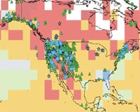Areas of significant changes to Earth systems observed in North America over the last 20 years, represented by various symbols, are linked with areas of rising temperatures, noted in red. Credit: NASA