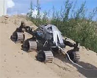A still for a video of a wheeled rover chassis demonstrating its difficulty in overcoming a sandy slope of just 20 degrees inclination. Robotics vehicles (rovers) using wheeled locomotion principles cannot negotiate slopes found in lunar craters, unless some special provisions are used. A rover chassis of the automation and robotics laboratories at ESTEC is here shown as it tries to climb up a sand dune of about 20 degrees inclination. It can clearly be seen that the progress of the rover is extremely slow as the rovers slips on the sand. The ESA Lunar Robotics Challenge has been launched in order to investigate alternative locomotion principles or special provisions for wheeled rovers, to enable a rover to descend into a lunar crater and safely return back to surface. Credits: ESA