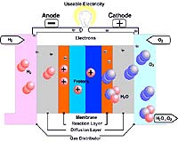 Upton NY (SPX) Dec 14, 2007 Researchers at the U.S. Department of Energy's Brookhaven National Laboratory have unveiled important details about a class of catalysts that could help improve the performance of fuel cells. With the goal of producing "clean" hydrogen for fuel cell reactions in mind, the researchers determined why two next-generation catalysts including gold, cerium, titanium, and oxygen nanomaterials exhibit very high activity. Their results will be published online in the December 14, 2007, edition of the journal Science. Fuel cells combine hydrogen and oxygen without combustion to produce direct electrical power and water. They are attractive as a source of power for transportation applications because of their high energy efficiency, the potential for using a variety of fuel sources, and their zero emissions. However, a major problem facing this technology is that the hydrogen-rich materials feeding the reaction often contain carbon monoxide (CO), which is formed during hydrogen production. Within a fuel cell, CO "poisons" the expensive platinum-based catalysts that convert hydrogen into electricity, deteriorating their efficiency over time and requiring their replacement. "Fuel cell reactions are very demanding processes that require very pure hydrogen," said Brookhaven chemist Jose Rodriguez. "You need to find some way to eliminate the impurities, and that's where the water-gas shift reaction comes into play." The "water-gas shift" (WGS) reaction combines CO with water to produce additional hydrogen gas and carbon dioxide. With the assistance of proper catalysts, this process can convert nearly 100 percent of the CO into carbon dioxide. Rodriguez's group, which includes researchers from Brookhaven's chemistry department, the Center for Functional Nanomaterials (CFN), and the Central University of Venezuela, studied two "next-generation" WGS nanoscale catalysts: gold-cerium oxide and gold-titanium oxide. "These nanomaterials have recently been reported as very efficient catalysts for the WGS reaction," said Brookhaven chemist Jan Hrbek. "This was a surprising finding because neither bulk gold nor bulk ceria and titania are active as catalysts." To determine how these nanocatalysts work, the research team developed so-called "inverse model catalysts." The WGS catalysts usually consist of gold nanoparticles dispersed on a ceria or titania surface - a small amount of the expensive metal placed on the inexpensive oxide. But to get a better look at the surface interactions, the researchers placed ceria or titania nanoparticles on a pure gold surface. "For the first time, we established that although pure gold is inert for the WGS reaction, if you put a small amount of ceria or titanium on it, it becomes extremely active," Rodriguez said. "So although these inverse catalysts are just models, they have catalytic activity comparable to, and sometimes better than, the real deal." Using a technique called x-ray photoelectron spectroscopy at Brookhaven's National Synchrotron Light Source, as well as scanning tunneling microscopy and calculations, the researchers discovered that the catalysts' oxides are the reason for their high activity. "The oxides have unique properties on the nanoscale and are able to break apart water molecules, which is the most difficult part of the WGS reaction," Hrbek said. Added Brookhaven physicist Ping Liu: "After you dissociate the water, the reaction continues on to eliminate CO. But if you don't have nanosized oxide particles, none of this will work." The researchers plan to continue their study of these catalysts at the NSLS and CFN in order to further explore the reaction mechanism and optimize its performance. Related Links DOE/Brookhaven National Laboratory Powering The World in the 21st Century at Energy-Daily.com