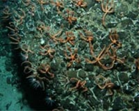 Washington DC (SPX) May 19, 2008 Census of Marine Life-affiliated scientists, plumbing the secrets of a vast underwater mountain range south of New Zealand, captured the first images of a novel "Brittlestar City" established against daunting odds on the peak of a seamount - an underwater summit taller than the world's tallest building. Its cramped starfish-like inhabitants, tens of millions living arm tip to arm tip, owe their success to the seamount's shape and to the swirling circumpolar current flowing over and around it at roughly four kilometers per hour. It allows Brittlestar City's underwater denizens to capture passing food simply by raising their arms, and it sweeps away fish and other hovering would-be predators. Discovery of this marine metropolis, announced today along with important new insights into seamount geology and physics, highlighted a month-long April expedition to survey the Macquarie Ridge aboard the Research Vessel Tangaroa of New Zealand's National Institute of Water and Atmospheric Research, host of the Census of Marine Life seamount programme, CenSeam. The voyage was largely funded by the New Zealand Foundation for Research, Science and Technology. Formed at least 12.5 million years ago, Macquarie Ridge stretches 1,400 km south from New Zealand to just above the Antarctic Circle. A multi-disciplinary scientific team from New Zealand and Australia extensively sampled this intriguing ecosystem deep beneath waves familiar to fishing trawlers but rarely reached by scientists. Macquarie Ridge is one of a few places where the Antarctic Circumpolar Current is detoured in its endless clockwise churn at the globe's southernmost latitudes - playing a vital part in the global ecosystem, merging and mixing waters of the Atlantic, Indian and Pacific Oceans. Usually corals and sponges dominate seamount peaks, filtering food that arrives on the current. Biologists aboard the Tangaroa believe Brittlestar City is the first dense aggregation of another filter feeder, the brittlestar, ever found atop a seamount, and they credit the summit's shape and extraordinary current circumstances there, 750-meters above the ocean floor. They photographed brown-black brittlestars numbering hundreds per square meter and estimate tens of millions of them populate the 100 square km flat top of the seamount. Brittlestars are echinoderms, relatives to starfish, sea cucumbers, sea lilies, and sea urchins. The two brittlestar species observed were tentatively identified via photographs sent from the ship to the Museum Victoria in Melbourne, Australia. There, taxonomist Tim O'Hara determined that the smaller, densely packed brown-black brittlestar species, found living arm tip to arm tip on the sand and cobble substrate of the peak, were likely Ophiacantha otagoensis or Ophiacantha fidelis. Larger orange-red species discovered down the seamount's flanks, filmed waving arms in the current to collect passing food, were likely Ophiacantha rosea. "We were excited to see such a huge assemblage of brittlestars on the Macquarie Ridge seamount. Not only is it amazing to see a vast array of one type of organism but the implications of the find for our understanding of the relative uniqueness of seamount assemblages are potentially far-reaching." said ecologist Dr. Ashley Rowden of NIWA.
