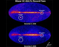 "3C 454.3 is millions of times farther away, yet the current flare makes it twice as bright as Vela," said Lise Escande at the Center for Nuclear Studies in Gradignan, near Bordeaux, France. "That represents an incredible energy release, and one the source can't sustain for very long."
