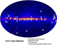 Greenbelt MD (SPX) Jan 08, 2009 NASA's Fermi Gamma-ray Space Telescope has discovered 12 new gamma-ray-only pulsars and has detected gamma-ray pulses from 18 others. The finds are transforming our understanding of how these stellar cinders work. "We know of 1,800 pulsars, but until Fermi we saw only little wisps of energy from all but a handful of them," says Roger Romani of Stanford University, Calif. "Now, for dozens of pulsars, we're seeing the actual power of these machines." A pulsar is a rapidly spinning and highly magnetized neutron star, the crushed core left behind when a massive sun explodes. Most were found through their pulses at radio wavelengths, which are thought to be caused by narrow, lighthouse-like beams emanating from the star's magnetic poles. If the magnetic poles and the star's spin axis don't align exactly, the spinning pulsar sweeps the beams across the sky. Radio telescopes on Earth detect a signal if one of those beams happens to swing our way. Unfortunately, any census of pulsars is automatically biased because we only see those whose beams sweep past Earth. "That has colored our understanding of neutron stars for 40 years," Romani says. The radio beams are easy to detect, but they represent only a few parts per million of a pulsar's total power. Its gamma rays, on the other hand, account for 10 percent or more. "For the first time, Fermi is giving us an independent look at what heavy stars do," he adds. Pulsars are phenomenal cosmic dynamos. Through processes not fully understood, a pulsar's intense electric and magnetic fields and rapid spin accelerate particles to speeds near that of light. Gamma rays let astronomers glimpse the particle accelerator's heart. "We used to think the gamma rays emerged near the neutron star's surface from the polar cap, where the radio beams form," says Alice Harding of NASA's Goddard Space Flight Center in Greenbelt, Md. "The new gamma-ray-only pulsars put that idea to rest." She and Romani spoke today at the American Astronomical Society meeting in Long Beach, Calif. Astronomers now believe the pulsed gamma rays arise far above the neutron star. Particles produce gamma rays as they accelerate along arcs of open magnetic field. For the Vela pulsar, the brightest persistent gamma-ray source in the sky, the emission region is thought to lie about 300 miles from the star, which is only 20 miles across. Existing models place the gamma-ray emission along the boundary between open and closed magnetic field lines. One version starts at high altitudes; the other implies emission from the star's surface all the way out. "So far, Fermi observations to date cannot distinguish which of these models is correct," Harding says. Because rotation powers their emissions, isolated pulsars slow as they age. The 10,000-year-old CTA 1 pulsar, which the Fermi team announced in October, slows by about a second every 87,000 years. Fermi also picked up pulsed gamma rays from seven millisecond pulsars, so called because they spin between 100 and 1,000 times a second. Far older than pulsars like Vela and CTA 1, these seemingly paradoxical objects get to break the rules by residing in binary systems containing a normal star. Stellar matter accreted from the companion can spin up the pulsar until its surface moves at an appreciable fraction of light speed. NASA's Fermi Gamma-ray Space Telescope is an astrophysics and particle physics partnership, developed in collaboration with the U.S. Department of Energy, along with important contributions from academic institutions and partners in France, Germany, Italy, Japan, Sweden and the United States. Francis Reddy NASA's Goddard Space Flight Center Share This Article With Planet Earth