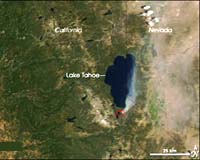 Strong Winds Fan Flames in Lake Tahoe Fire - This image from the Moderate Resolution Imaging Spectroradiometer (MODIS) on NASA's Aqua satellite shows the Angora Fire on June 26, 2007. The active fire area is outlined in red. Credit: NASA's MODIS Rapid Response