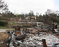 Ruins of two homes in the Trails community burned during the Witch and Guejito fires in 2007. To reduce structure loses from future Wildland Urban Interface fires, NIST has reconstructed a timeline of the fire events, including the defensive actions taken by first responders and homeowners. Credit: Maranghides, NIST
