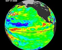 Pasadena CA (SPX) Oct 09, 2009 Since May 2009, the tropical Pacific Ocean has switched from a cool pattern of ocean circulation known as La Nina to her warmer sibling, El Nino. This cyclical warming of the ocean waters in the central and eastern tropical Pacific generally occurs every three to seven years, and is linked with changes in the strength of the trade winds. El Nino can affect weather worldwide, including the Atlantic hurricane season, Asian monsoon season and northern hemisphere winter storm season. But while scientists agree that El Nino is back, there's less consensus about its future strength. One of the characteristics that signal a developing El Nino is a change in average sea surface height compared to normal sea level. The NASA/French Space Agency Jason-1 and Ocean Surface Topography Mission/Jason-2 satellites continuously observe these changes in average sea surface height, producing near-global maps of the ocean's surface topography every 10 days. Recent data on sea-level height from the Jason-1 and Ocean Surface Topography Mission/Jason-2 satellites show that most of the equatorial Pacific is near normal (depicted in the images as green). The exceptions are the central and eastern equatorial Pacific, which are exhibiting areas of higher-than-normal sea surface heights (warmer-than-normal sea-surface temperatures) at 180 and 110 degrees west longitude. The latest image from Jason-2 reflects a 10-day data cycle centered around September 17, 2009. It shows a series of warm "bumps" visible along the equator, denoted in the image by a black line. Known as Kelvin waves, these pools of warm water were triggered when the normally westward-blowing trade winds weakened in late July and again in early September, sending them sliding eastward from the western Pacific toward the Americas. The Kelvin waves are 5 to 10 centimeters (2 to 4 inches) high, a few hundred kilometers wide and a few degrees warmer than surrounding waters. Traveling east at about 3 meters per second (6 miles per hour), they are expected to reach the coast of Peru in October. Yet the present condition of this year's El Nino is dwarfed in comparison with the "macho" El Nino of 1997-1998, which brought devastating floods to California and severe drought to Indonesia, Australia and the Philippines. That leads some scientists, such as Bill Patzert, an oceanographer and climatologist at NASA's Jet Propulsion Laboratory, Pasadena, Calif., to express uncertainty as to whether this El Nino event will intensify enough to deliver the dramatic impacts seen during that last intense El Nino in 1997-1998. "For the past few months, the trade winds have weakened somewhat, but whether the new Kelvin waves traveling eastward across the Pacific will be adequate to pump this El Nino up enough to reinvigorate it and deliver any real impacts remains uncertain," Patzert says. Patzert notes that it is important to remember that not all El Ninos are created equal. "Some El Ninos are show stoppers, but most are mild to modest, with minimal to mixed impacts," he says. He notes that since 1998, there have been three mild to moderate El Nino's: in 2002-2003, 2004-2005 and 2006-2007. None of these events delivered the heart-thumping impacts of the monster El Nino of 1997-1998. During the winter of 1997-1998, Southern California was soaked with nearly 79 centimeters (more than 31 inches) of rain (twice Los Angeles' normal annual rainfall amount of about 38.5 centimeters, or 15.14 inches). In addition, there was heavy snowpack in the Sierra Nevada and Rocky Mountains. In comparison, during the past four winters, Los Angeles has averaged only 24.6 centimeters (9.7 inches) of rain (64 percent of normal), and snowpacks have been stingy. In fact, Patzert notes that this El Nino bears many similarities to the 2006-2007 El Nino event. During that winter, much of the American Southwest experienced record-breaking drought, and Los Angeles had its driest winter in recorded history. So what will El Nino 2009-2010 hold in store for the world this coming winter? In spite of the uncertainties, experienced climate forecasters around the world will continue to monitor the Pacific closely for further signs of El Nino development and will give it their best shot. "Unless present El Nino conditions intensify, I believe this El Nino is too weak to have a major influence on many weather patterns," he says. "A macho El Nino like that of 1997-1998 is off the board, but I'm hoping for a relaxation in the tropical trade winds and a surprise strengthening of El Nino that could result in a shift in winter storm patterns over the United States. If the trade winds decrease, the ocean waters will continue to warm and spread eastward, strengthening the El Nino. That scenario could bring atmospheric patterns that will deliver much-needed rainfall to the southwestern United States this winter. If not, the dice seem to be loaded for below-normal snowpacks and another drier-than-normal winter." Still, Patzert remains hopeful. "Don't give up on this El Nino," he added. "He might make a late break and put his spin on this fall and winter's weather systems." Share This Article With Planet Earth
