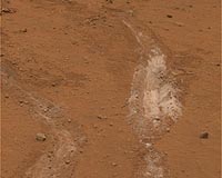 As the rover drove away from Tyrone, its jammed right front wheel dug this trench; the site was later dubbed Gertrude Weise. Scientists first thought the white soil was caused by sulfate minerals, but the Mini-TES instrument revealed its high silica content, and the rover returned to the site to confirm the discovery. credit: NASA/JPL/Cornell University. Detailed photos and captions avaialable.